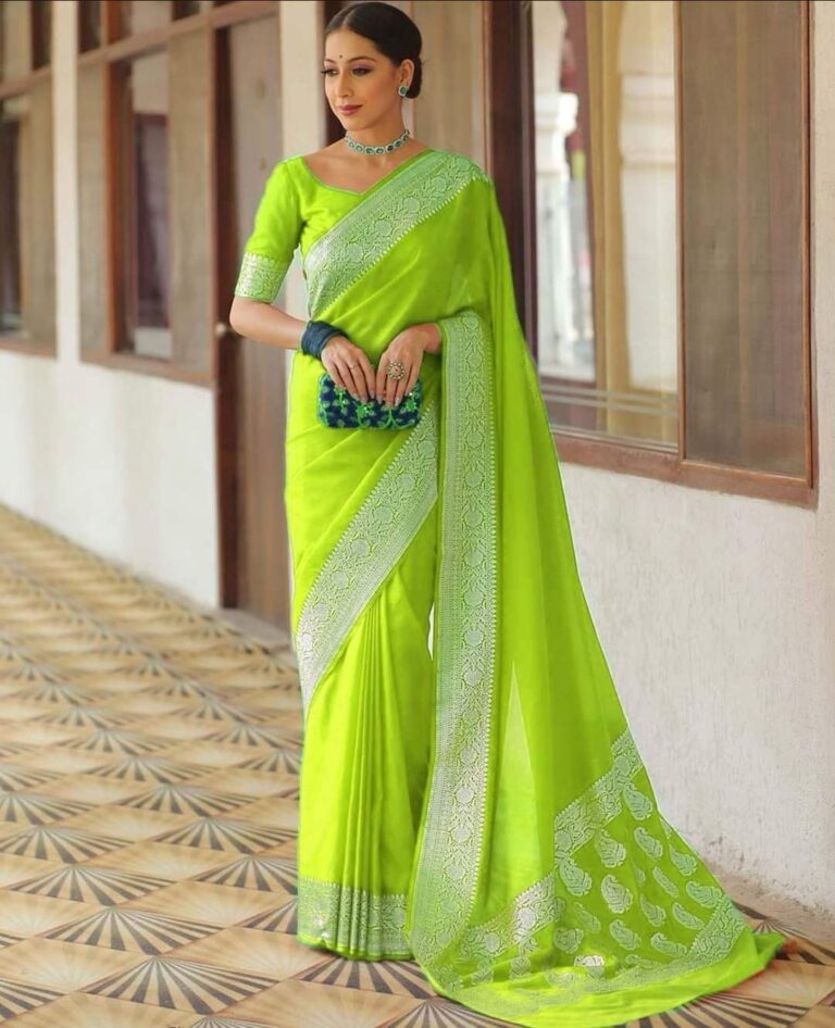 Meher Banarasi Kora Organza Saree – Coral Green Elegance with Silver Zari Border