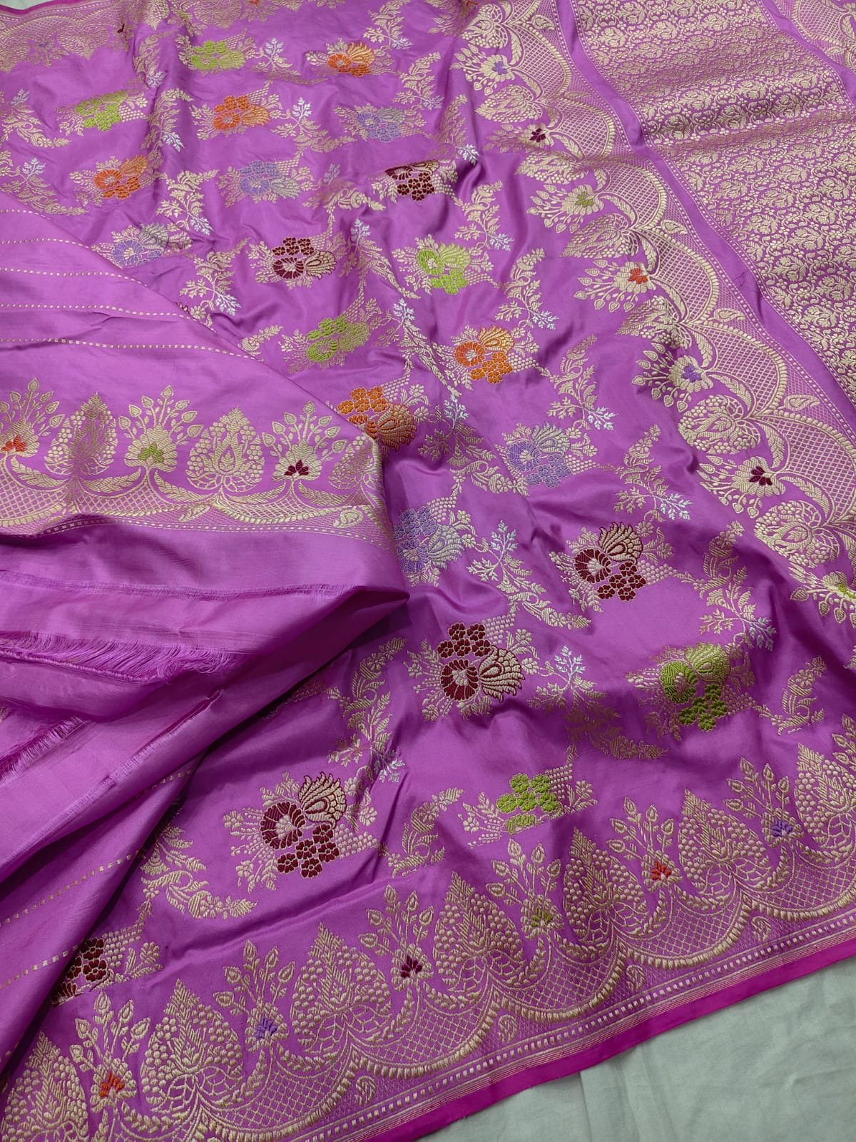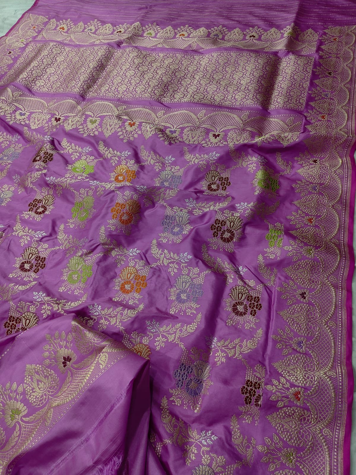 Embrace subtle luxury with this pure handloom Katan silk saree, intricately woven using the traditional Kadhuwa technique over 70+ days. The soothing lilac purple hue exudes grace, while delicate zari detailing enhances its timeless charm. Perfect for elegant occasions, this saree blends softness with royal craftsmanship. An exclusive premium creation by BNS Saree Centre, designed for refined sophistication.