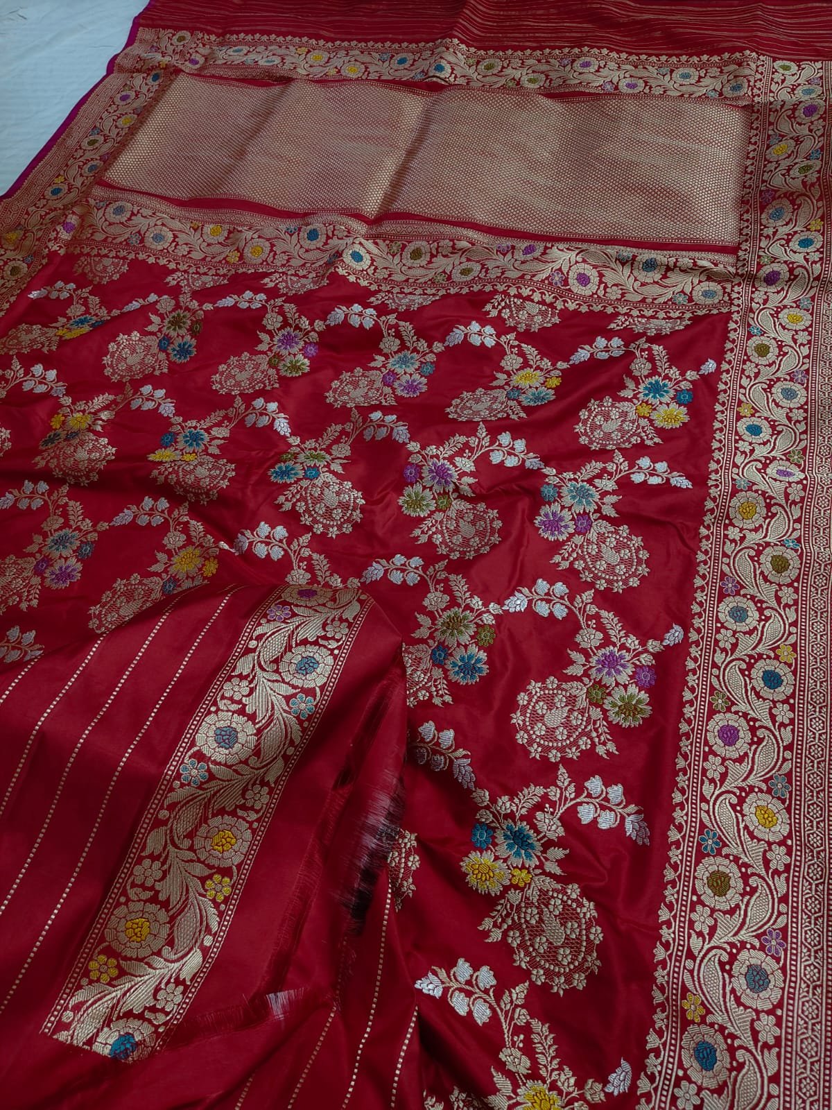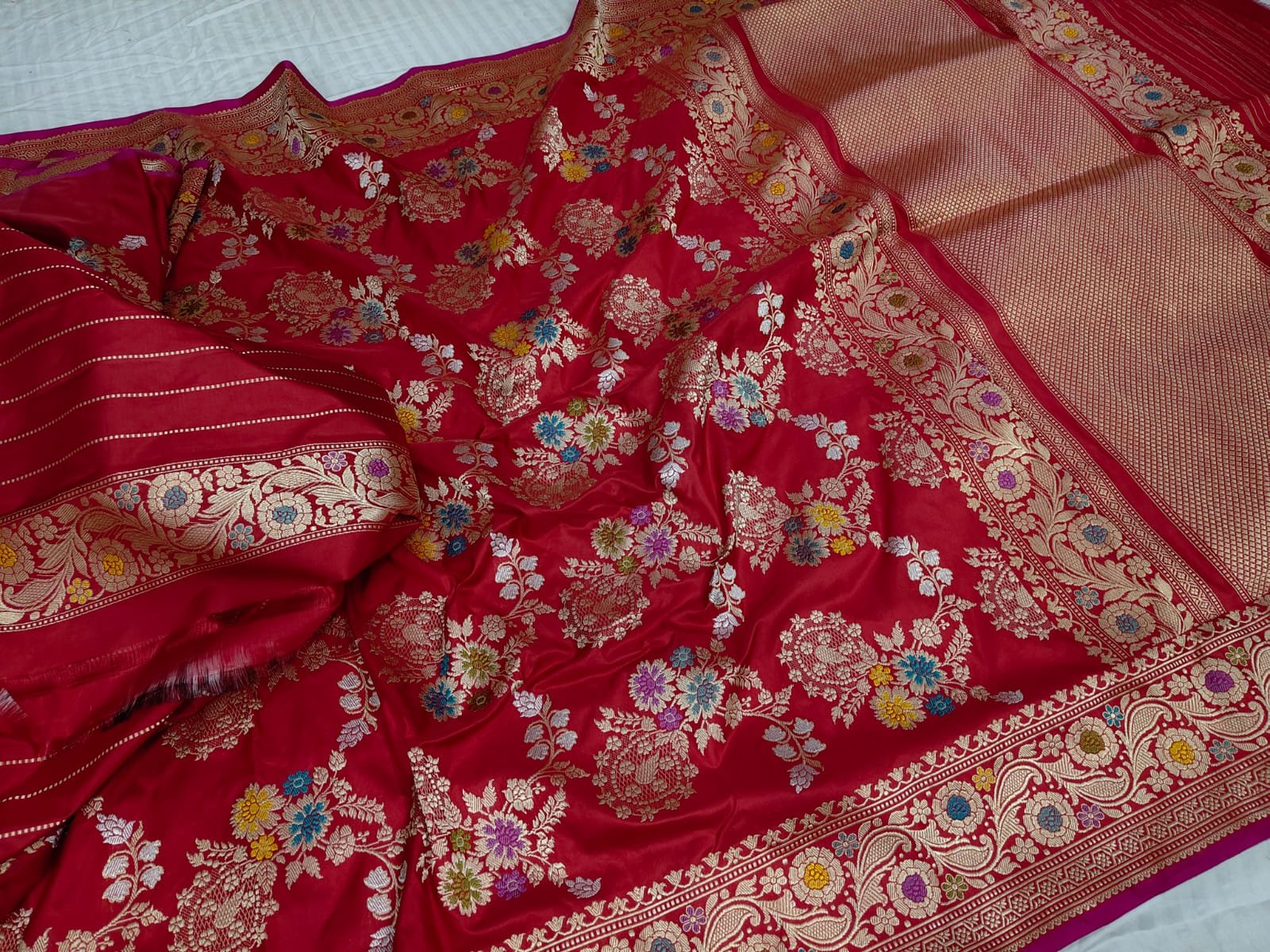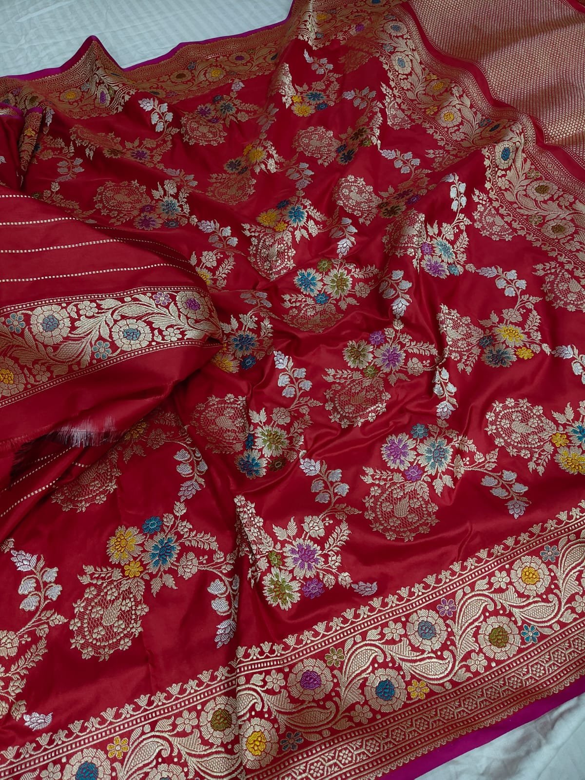 Drape yourself in timeless royalty with this pure handloom Katan silk saree, intricately woven using the Kadhuwa technique over 90+ days. Featuring delicate meenakari floral motifs and a rich zari border, this saree exudes grace and luxury. The vibrant crimson red hue enhances its bridal charm and festive appeal. An exclusive premium creation by BNS Saree Centre, perfect for grand occasions.