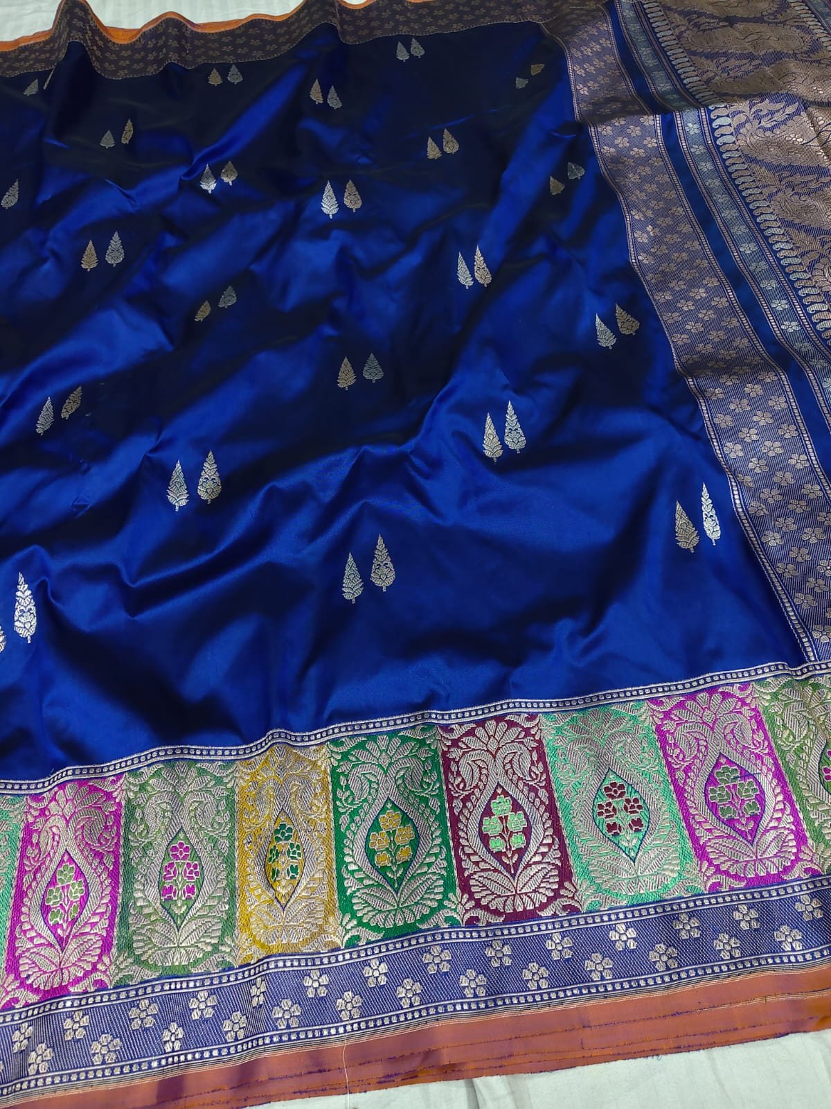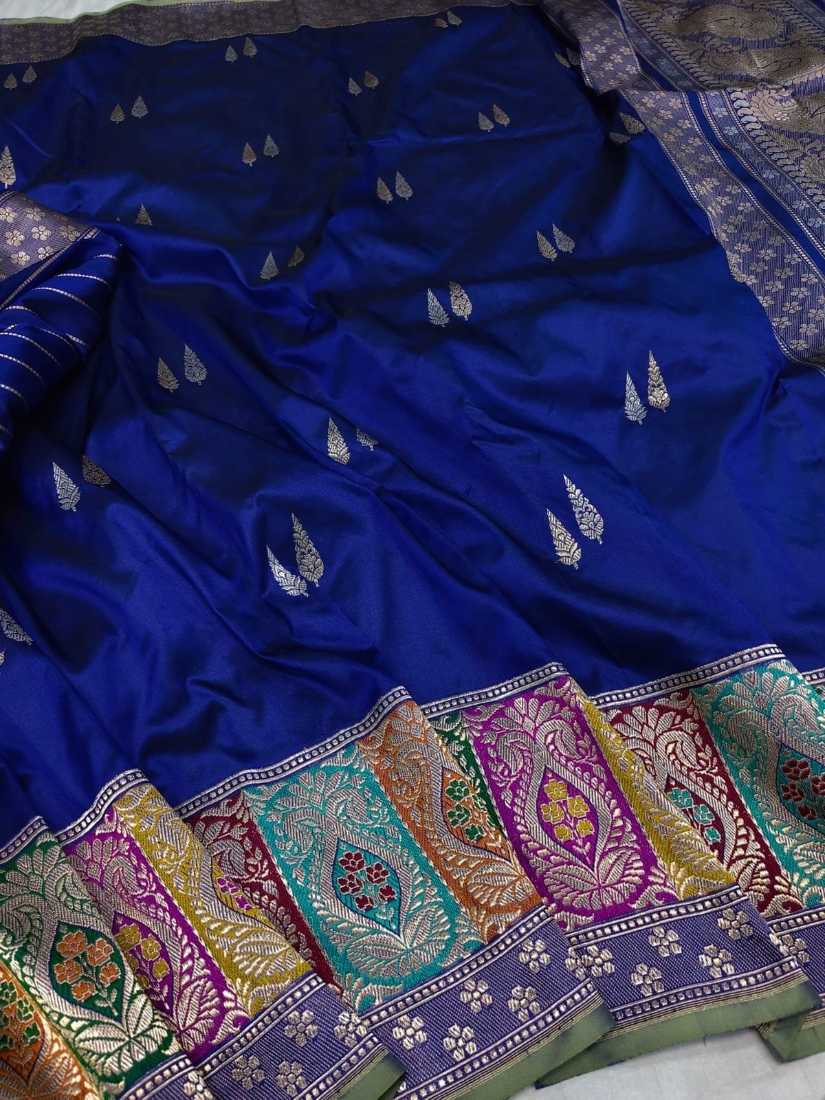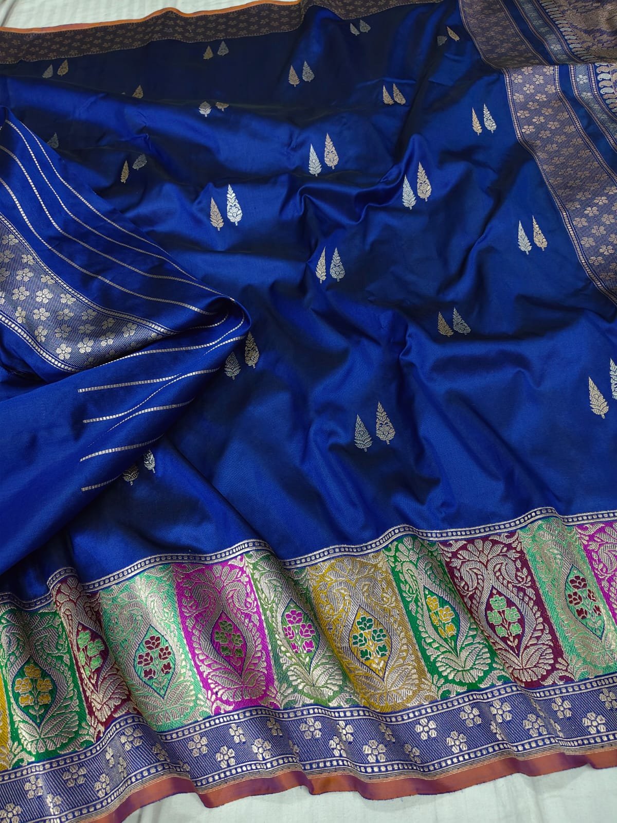 BNS Rajwanshi Kadhuwa Pure Katan Silk Saree – Royal Blue Multicolor Border