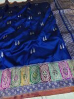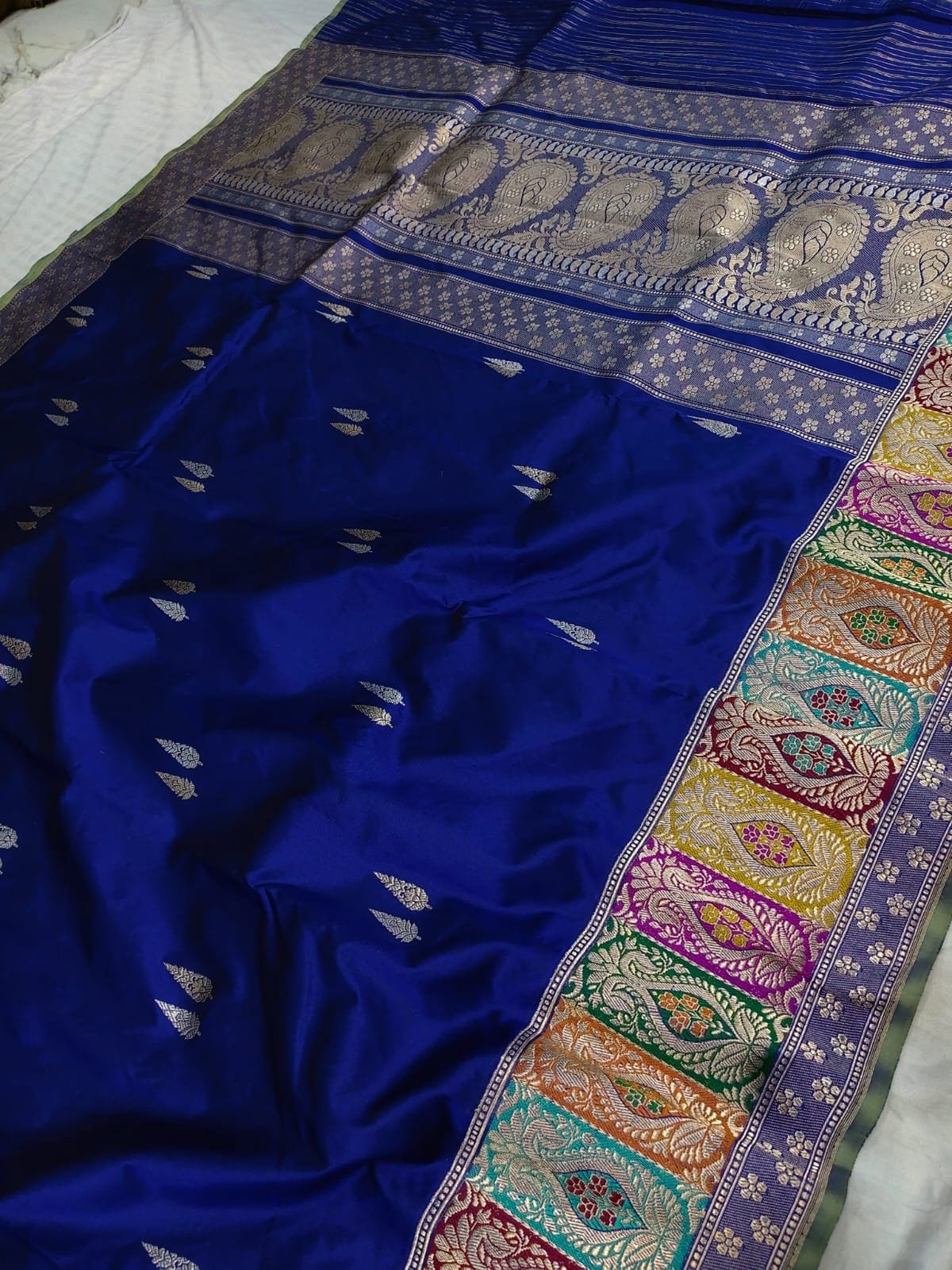 Experience royal sophistication with this pure handloom Katan silk saree, crafted using the intricate Kadhuwa weaving technique over 70+ days. The deep royal blue base is beautifully enhanced with multicolor rectangular border motifs and rich zari detailing. A perfect blend of tradition and contemporary elegance, this saree is designed to make a statement. An exclusive luxury piece by BNS Saree Centre for weddings and grand occasions.