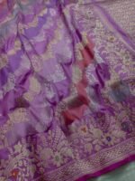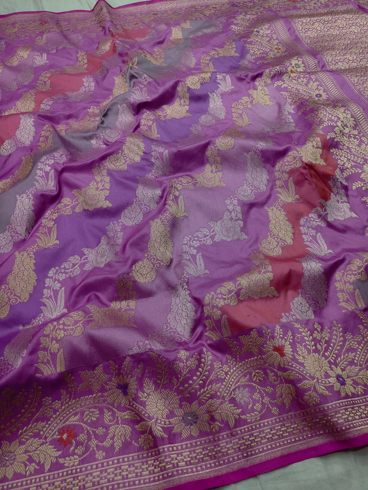Step into regal elegance with this pure Katan handloom Kadhuwa silk saree, crafted over 70+ days by skilled Banarasi artisans. Featuring stunning diagonal floral vine motifs with zari weaving and a richly detailed border, this saree blends tradition with a modern royal appeal. The unique dual-tone effect with purple, grey, and subtle pink hues adds unmatched sophistication. An exclusive luxury creation by BNS Saree Centre, perfect for weddings and premium occasions.