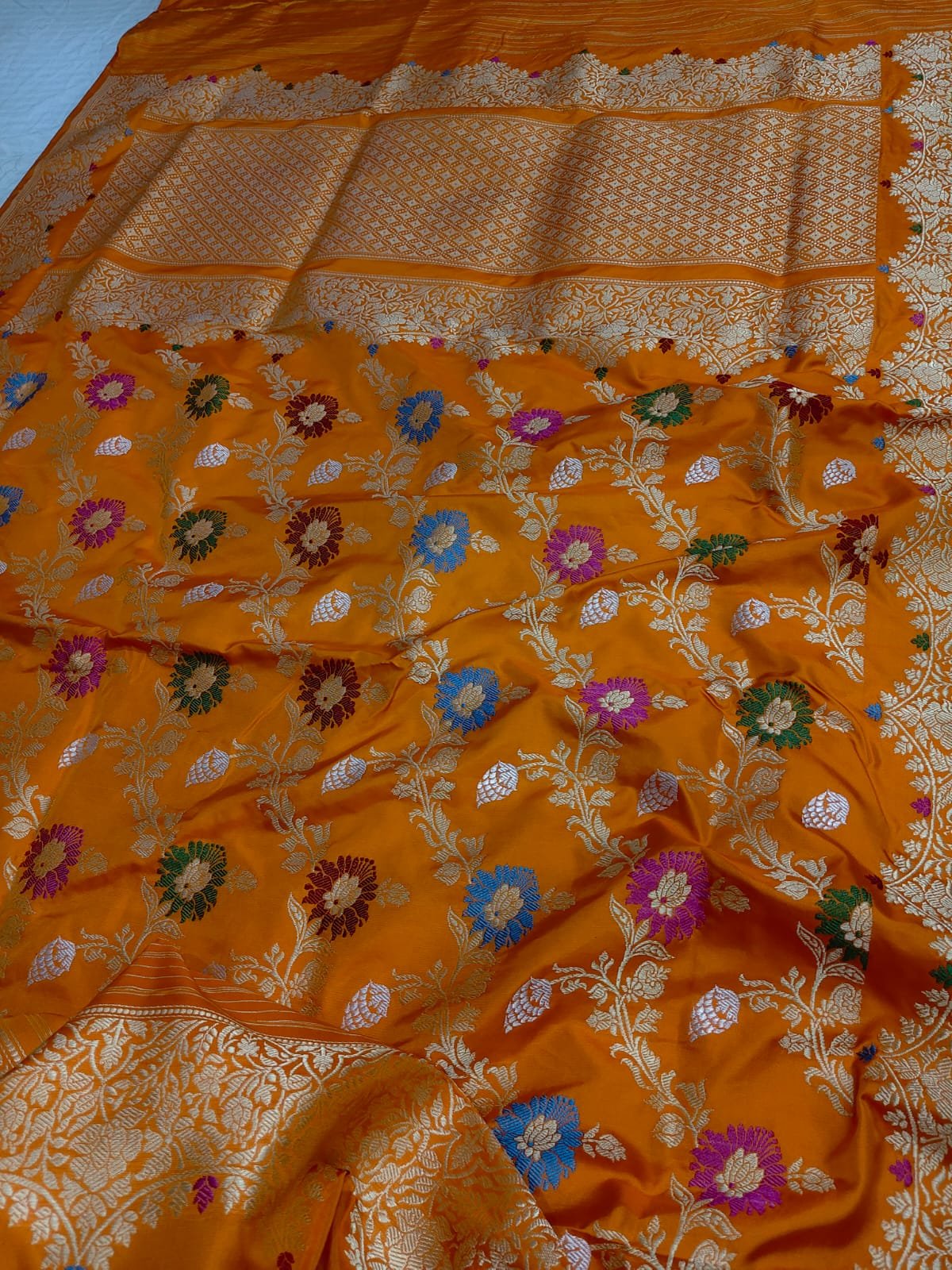 BNS Surya Meenakari Kadhuwa Pure Katan Silk Saree – Orange Floral Royale