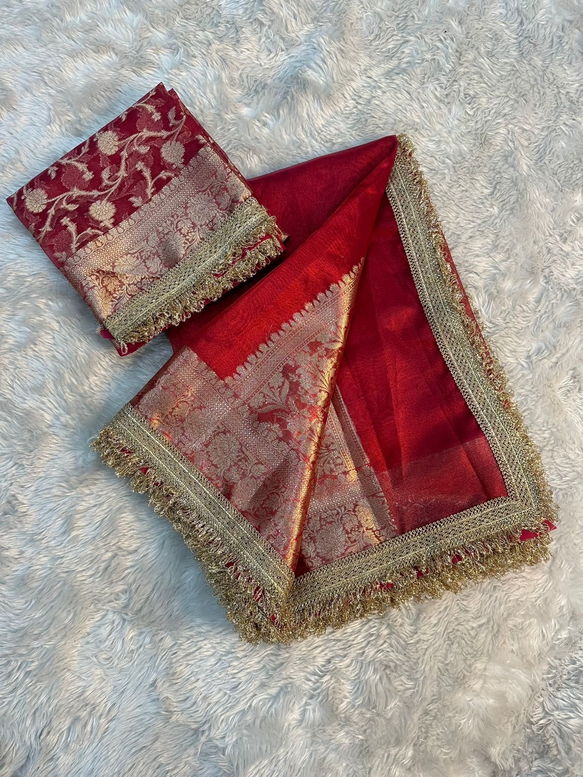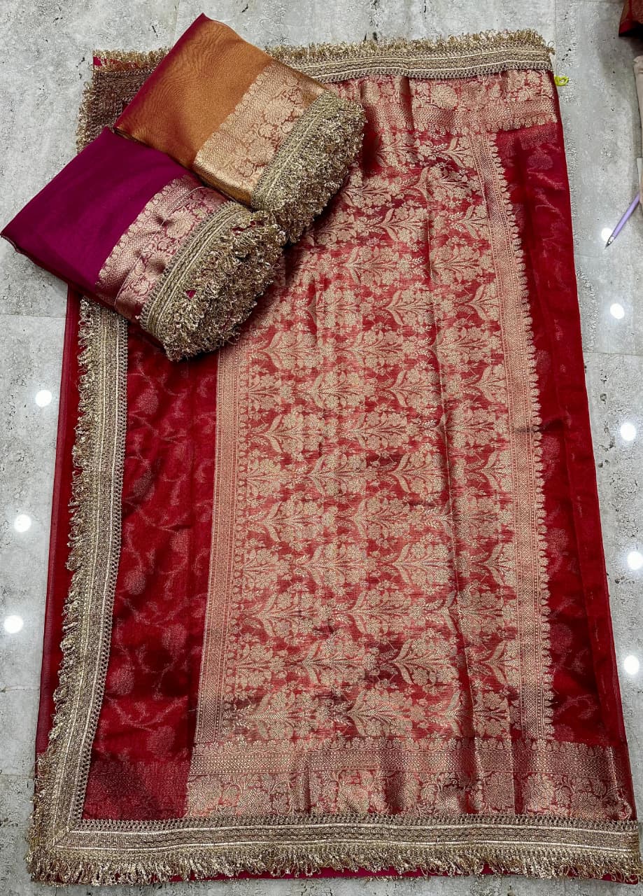 Premium Blood Red Banarasi Tissue Silk Saree with Rich Pallu & Blouse