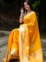 Keywords: yellow Banarasi saree, Ganga ghat inspired saree, soft warm silk Banarasi saree, handwoven Banarasi saree Varanasi, wedding Banarasi saree online, festive Banarasi saree