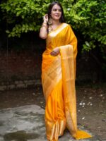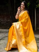 The vibrant yellow shade and ghat-inspired zari motifs capture the soul of Varanasi — radiant, sacred, and majestic. A true heirloom piece that celebrates light, love, and heritage.