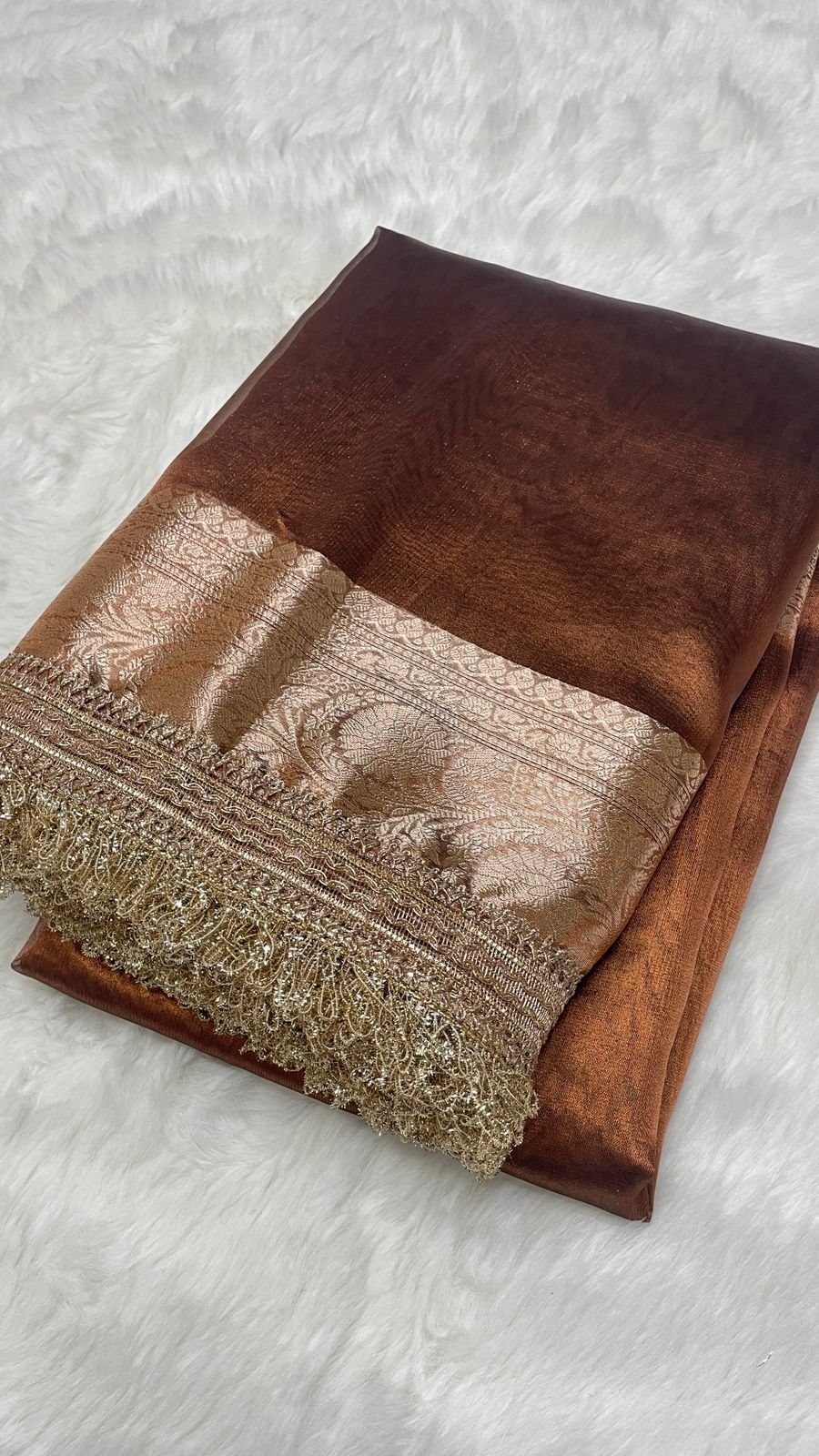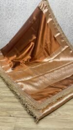 Fabric: Luxurious Banarasi Tissue, known for its soft sheen, fluid drape, and regal texture.