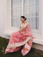 • Fabric: Premium Banarasi Tissue Silk — delicately woven for a soft, glossy, and lightweight drape.