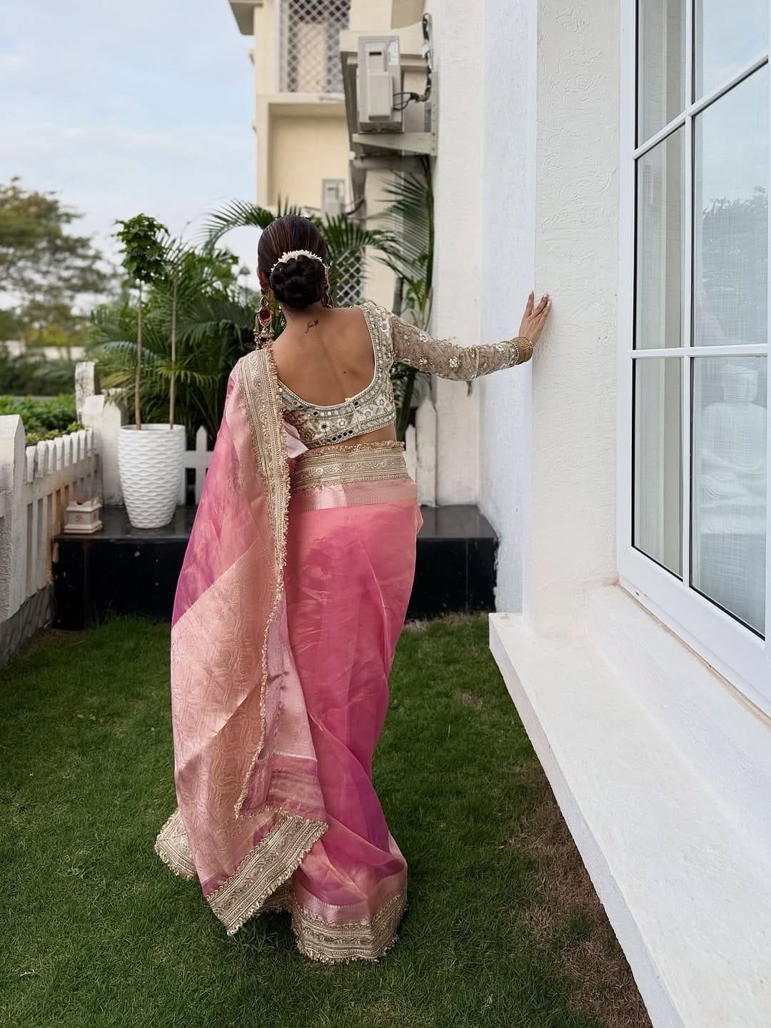 A mesmerizing rose-pink Banarasi tissue silk saree that glimmers in every light. Woven with fine golden zari threads, this saree is a statement of sheer sophistication — perfect for weddings, receptions, and festive celebrations. 💫