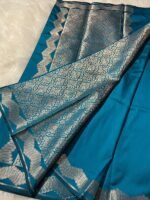 A luxurious Teal Blue Semi Katan Softy Silk Saree with rich golden zari work, crafted for a smooth drape and vibrant festive elegance.