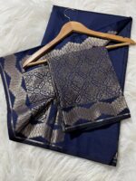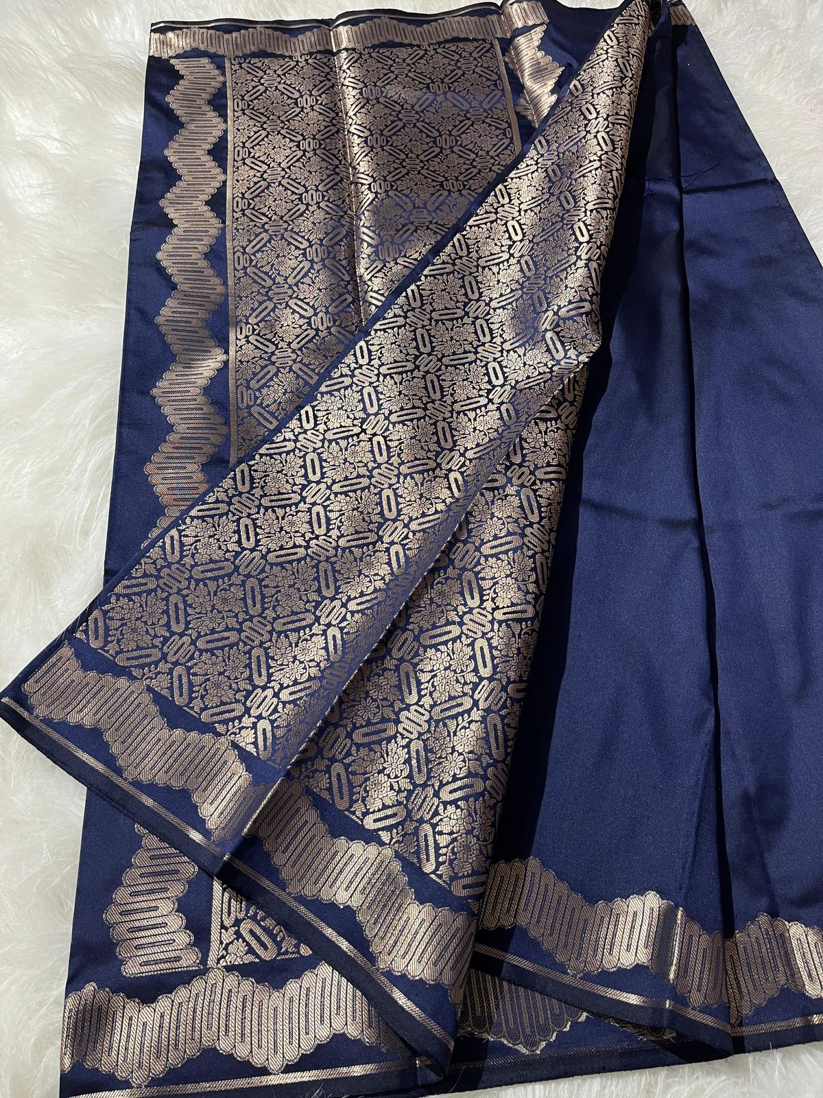 Step into effortless luxury with our Navy Blue Semi Katan Softy Silk Saree, featuring lustrous golden zari and a smooth, lightweight drape perfect for festive and traditional wear.