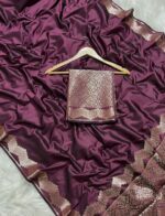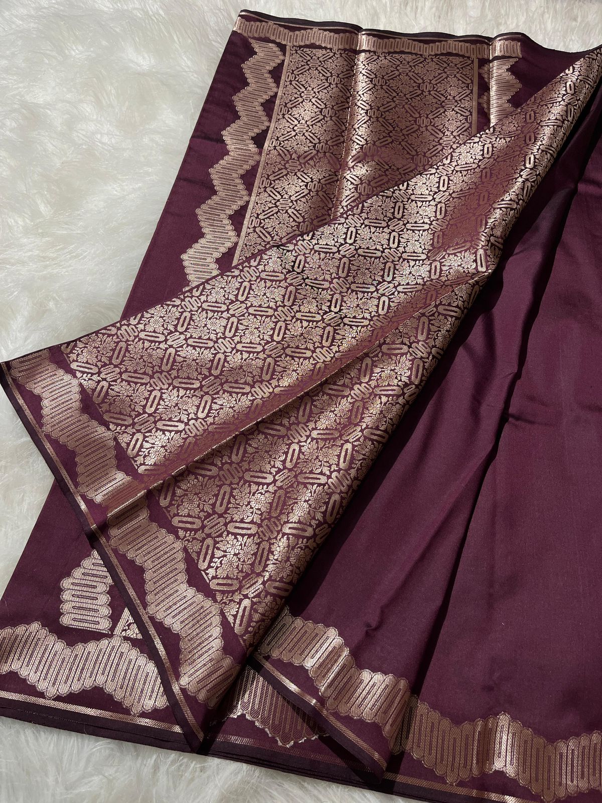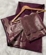 Experience sheer elegance with our Grape Wine Semi Katan Softy Silk Saree, enriched with golden zari detailing and a smooth, feather-soft drape — perfect for festive and premium occasions.