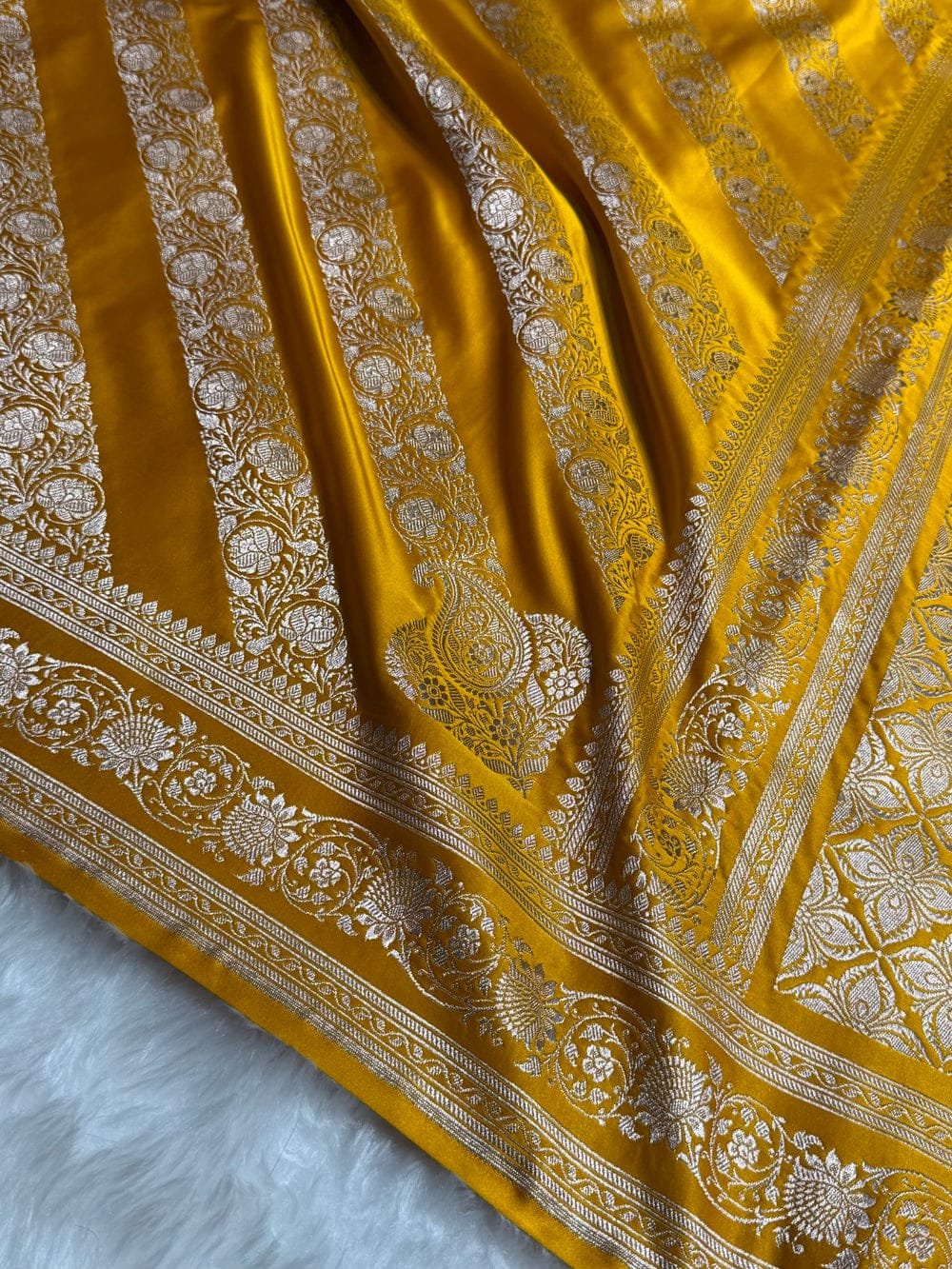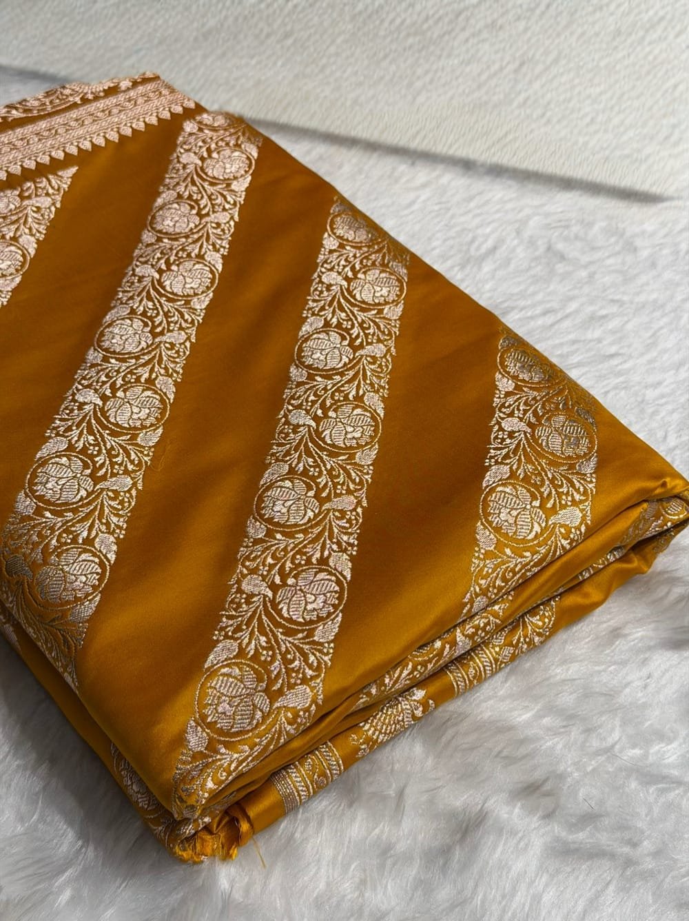Mustard Banarasi Floral Mashru Silk Saree — a radiant blend of warm mustard tones and elegant cross-pattern florals, crafted in rich mashru silk. A perfect fusion of heritage charm and modern grace, ideal for weddings and festive celebrations.