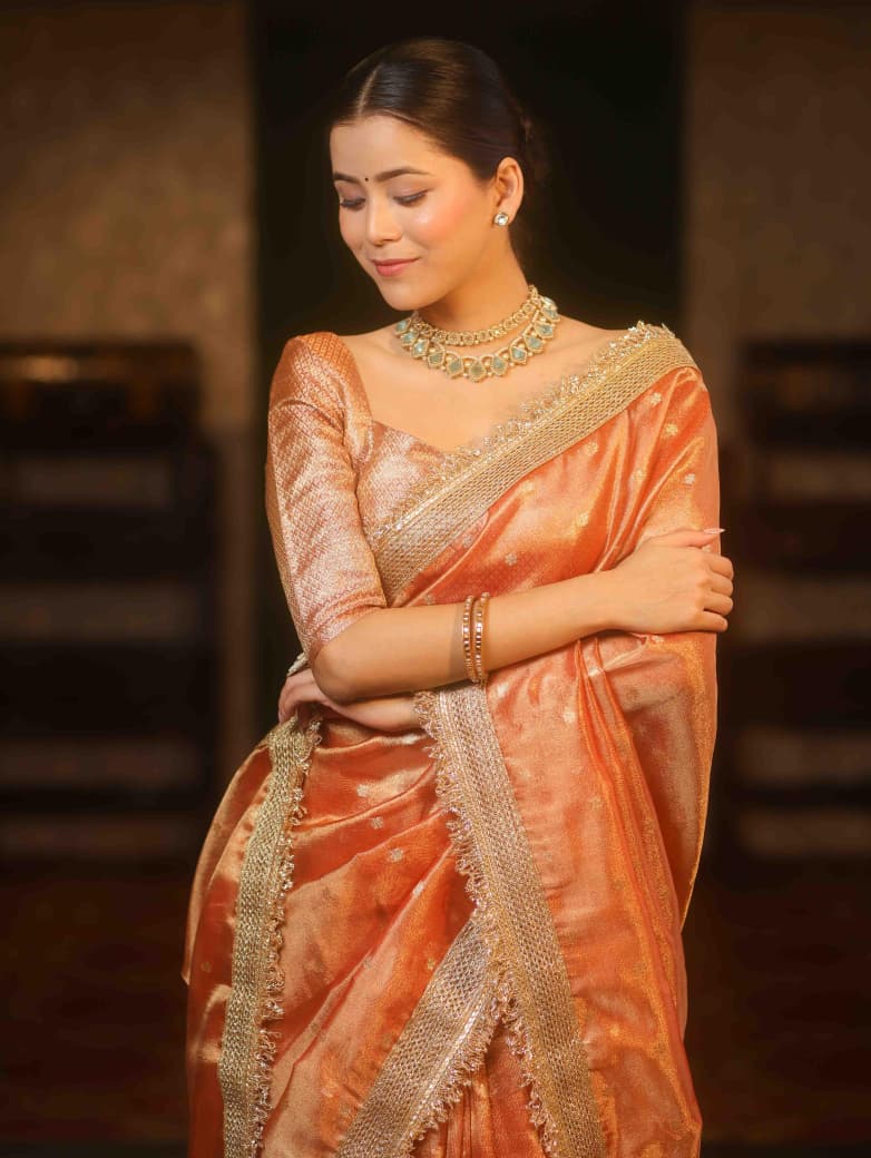 A perfect harmony of Banarasi tradition and festive charm — the glowing orange tissue silk with golden butis makes every moment shine brighter.