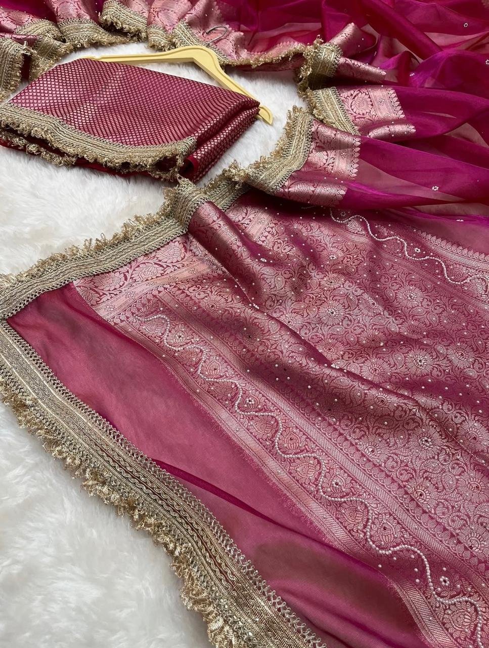 Maharani Rose Pink Tissue Silk Saree — a poetic blend of soft rose pink hues and regal Banarasi craftsmanship. Woven in luminous tissue silk and enhanced with premium lace borders and delicate stone embellishments, this saree radiates grace, femininity, and timeless elegance. A perfect choice for weddings, festivities, and luxury celebrations.