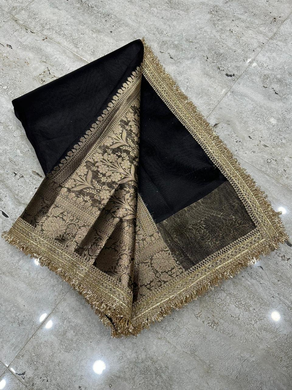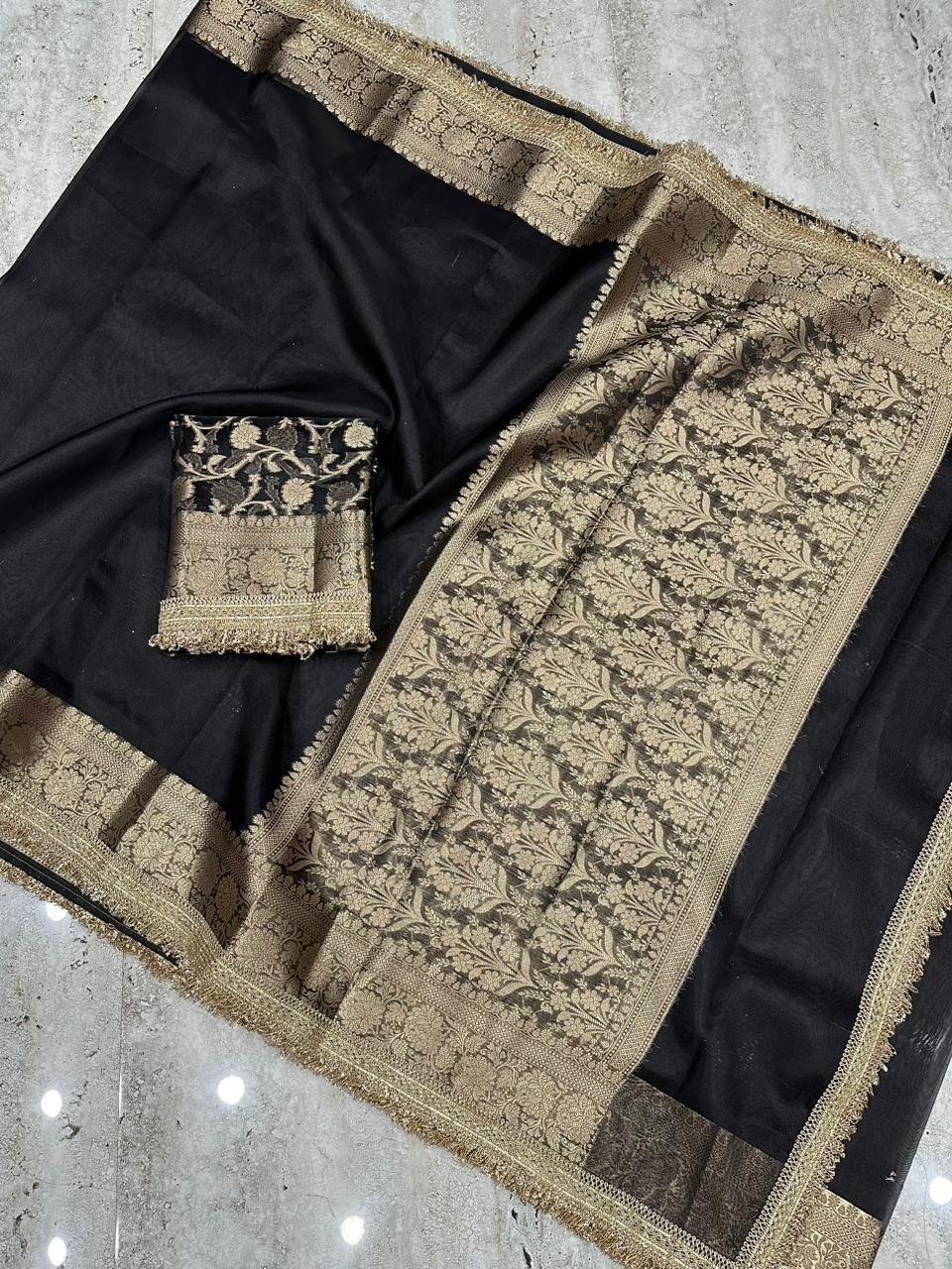 Highlight: The contrast of black tissue shimmer and golden zari creates a breathtaking, high-end aesthetic that’s impossible to ignore.