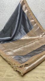 Subtle yet striking — this ash gray Banarasi tissue saree with a rich zari pallu, zari blouse, and lace border is a masterpiece of modern grace and Banarasi luxury, exclusively curated by BNS Saree Centre.