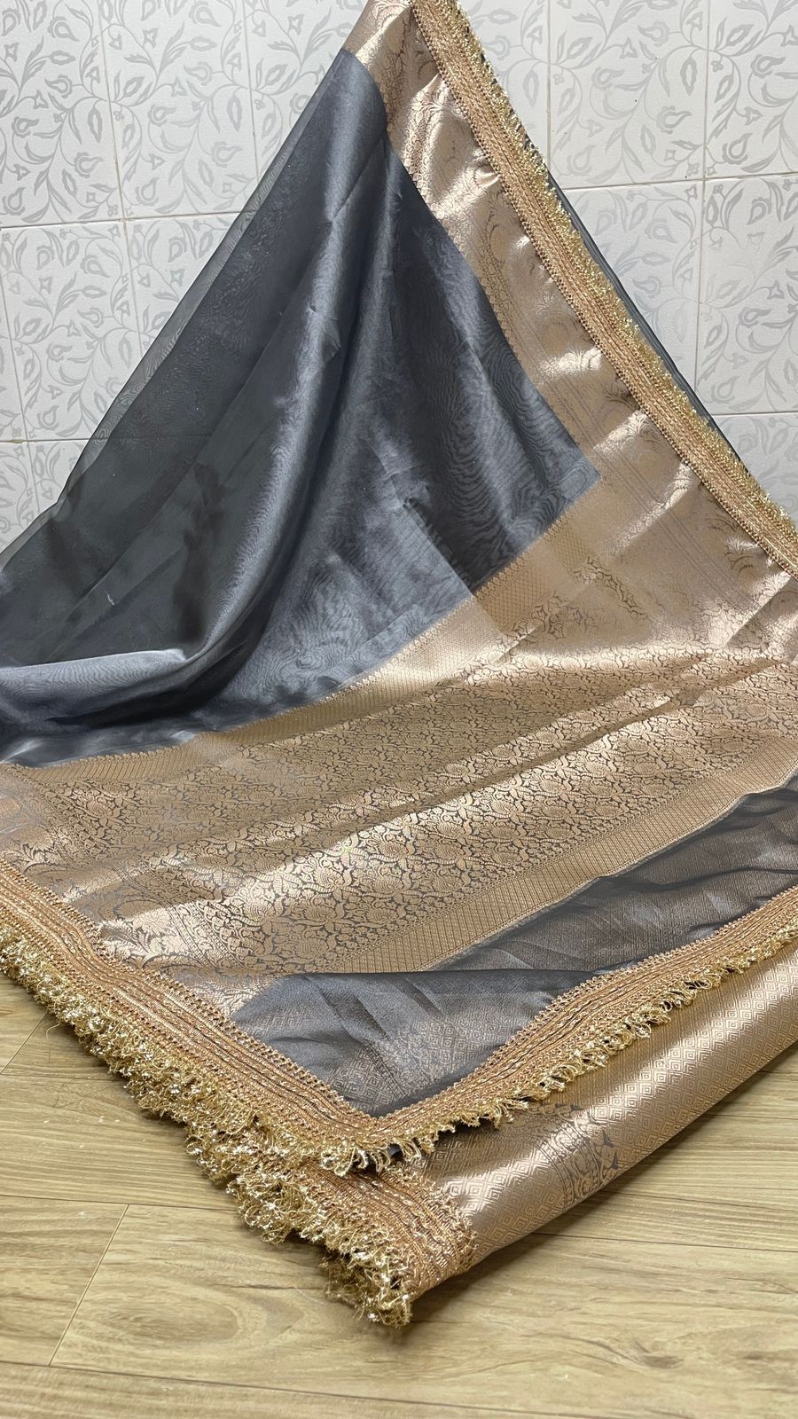 Moonlit Mist Banarasi Tissue Saree with Lace Border