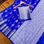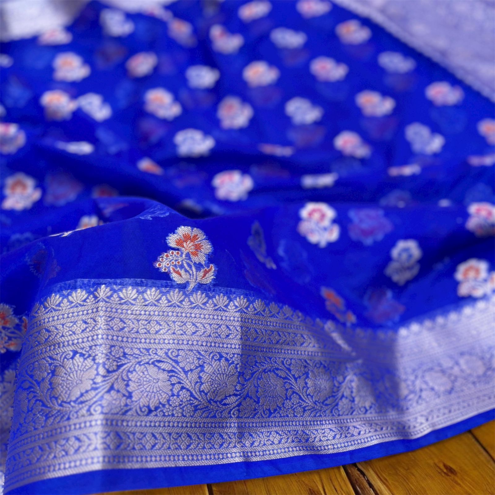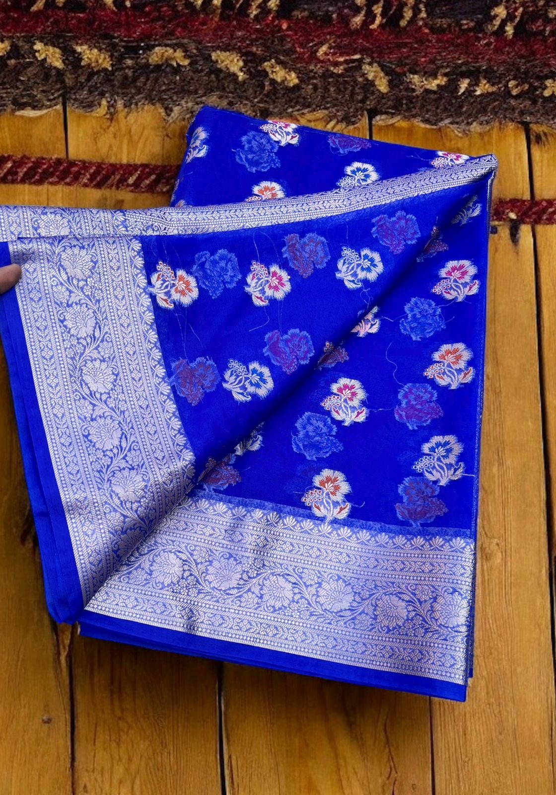 A royal affair in blue — this Kora Organza Banarasi saree with delicate floral weaving and a silver zari border from BNS Saree Centre is a symbol of sophistication and grace.