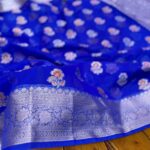 Be the first to review “Neelkamal Kora Organza Banarasi Saree – Floral Weave with Silver Zari Border” Cancel reply