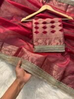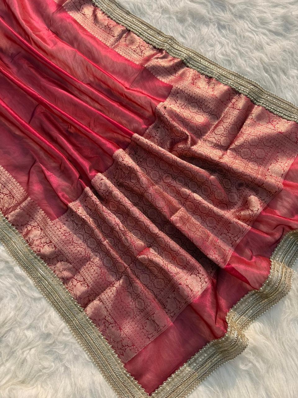 An opulent Banarasi tissue silk saree adorned with intricate zari weaving, a rich brocade border, and exquisite lace finishing. Designed for women who love timeless elegance with a touch of modern luxury.