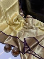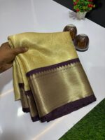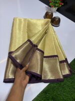 A saree that glows with divine grace — this Golden Tissue Silk Banarasi Saree with a royal purple border brings timeless charm and luxury to every occasion.