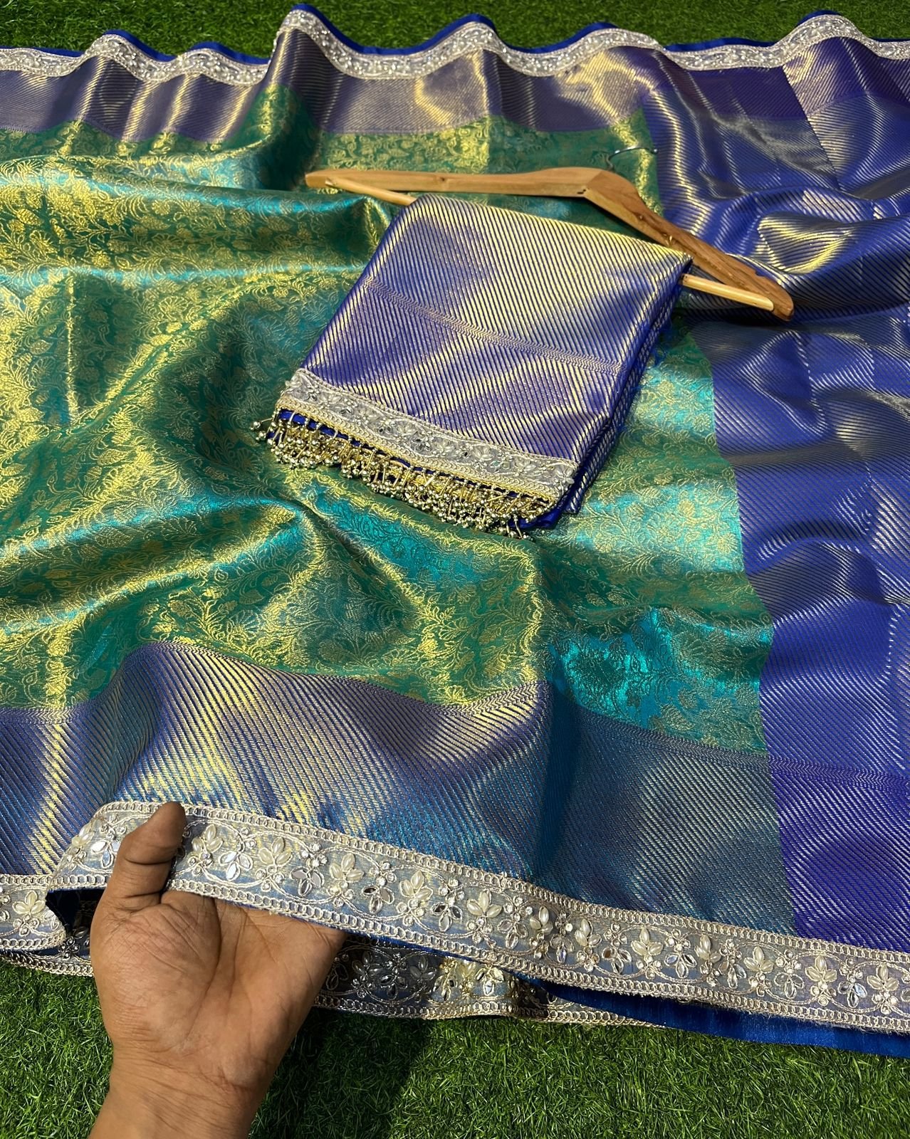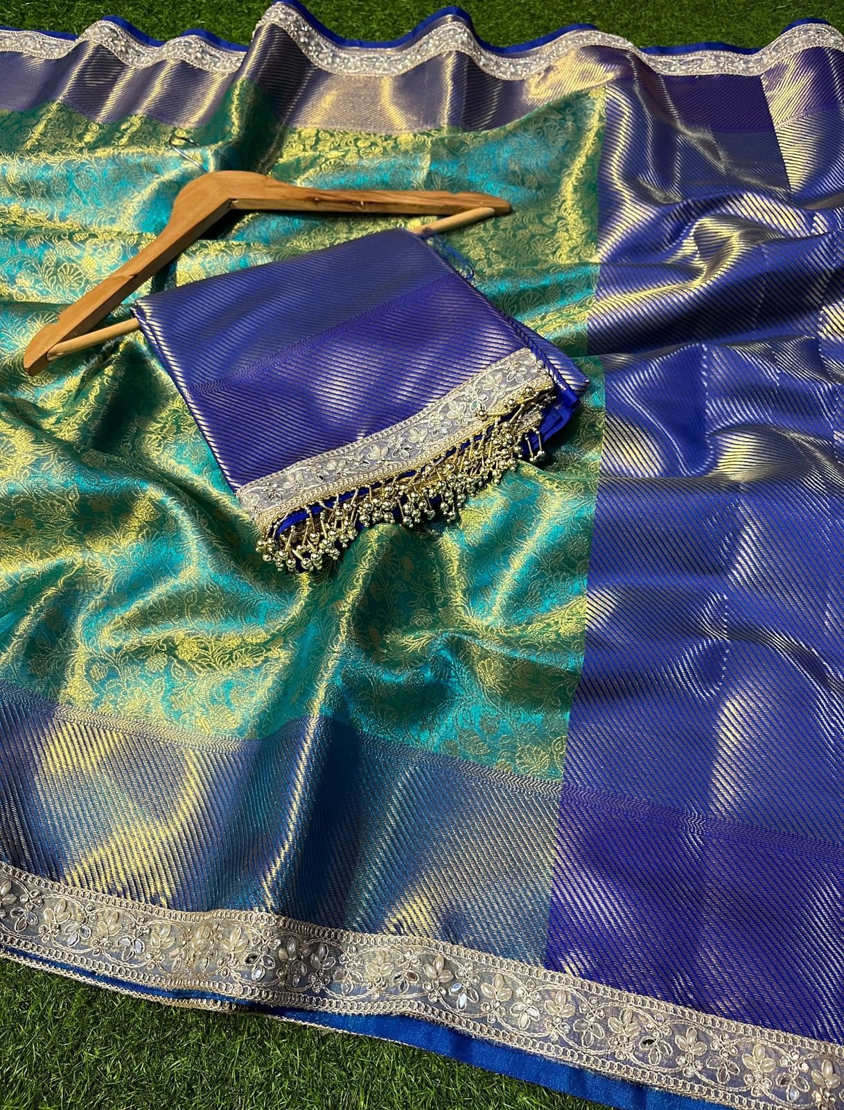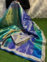 Premium Blue Green Tissue Zari Silk Tanchui Pattern with Lace Work