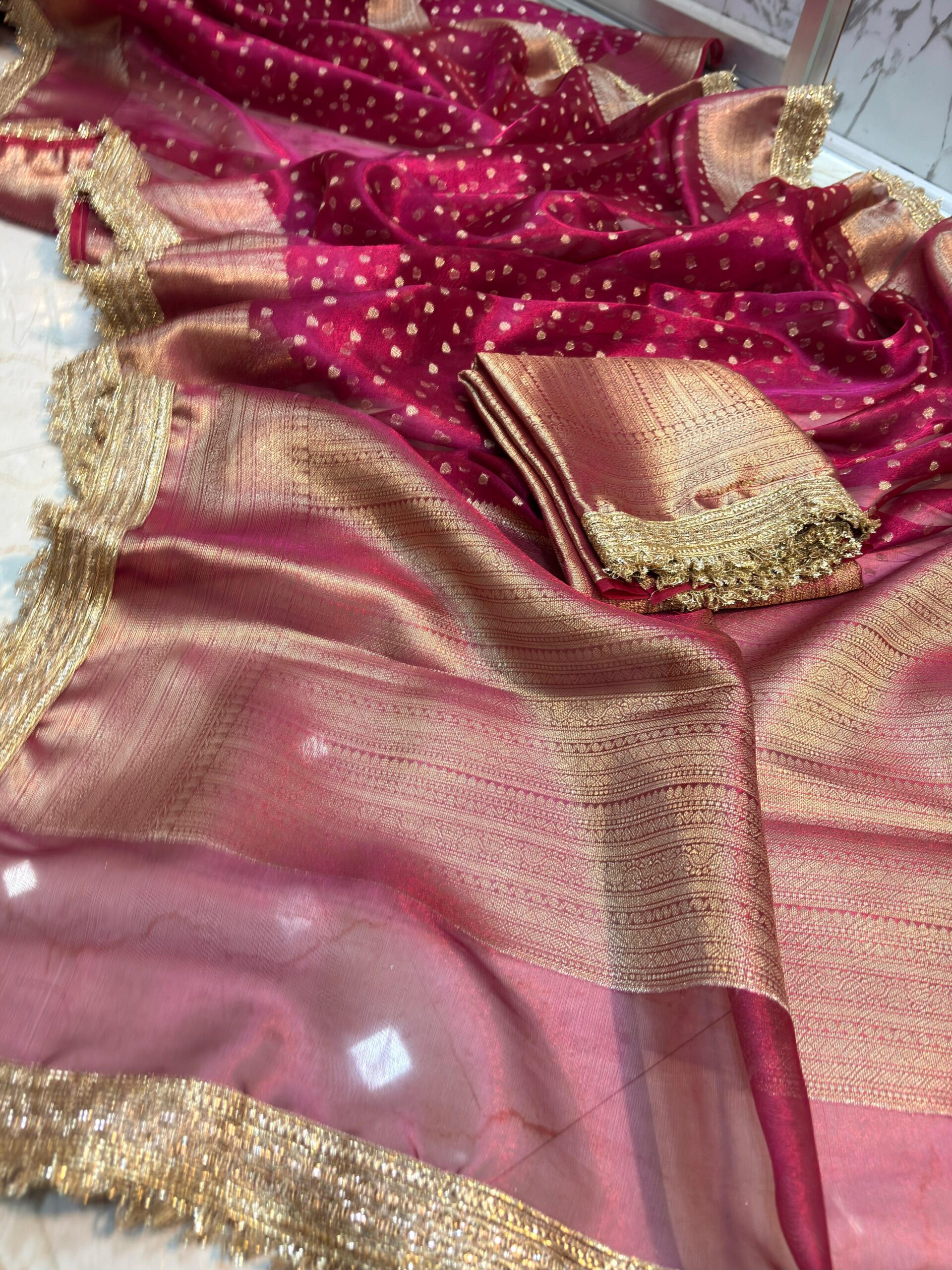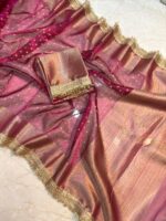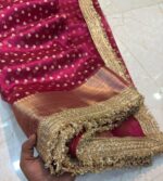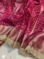 Shine like royalty in this hot pink Banarasi tissue saree, beautifully woven with golden zari — a stunning statement piece for every festive and wedding celebration.