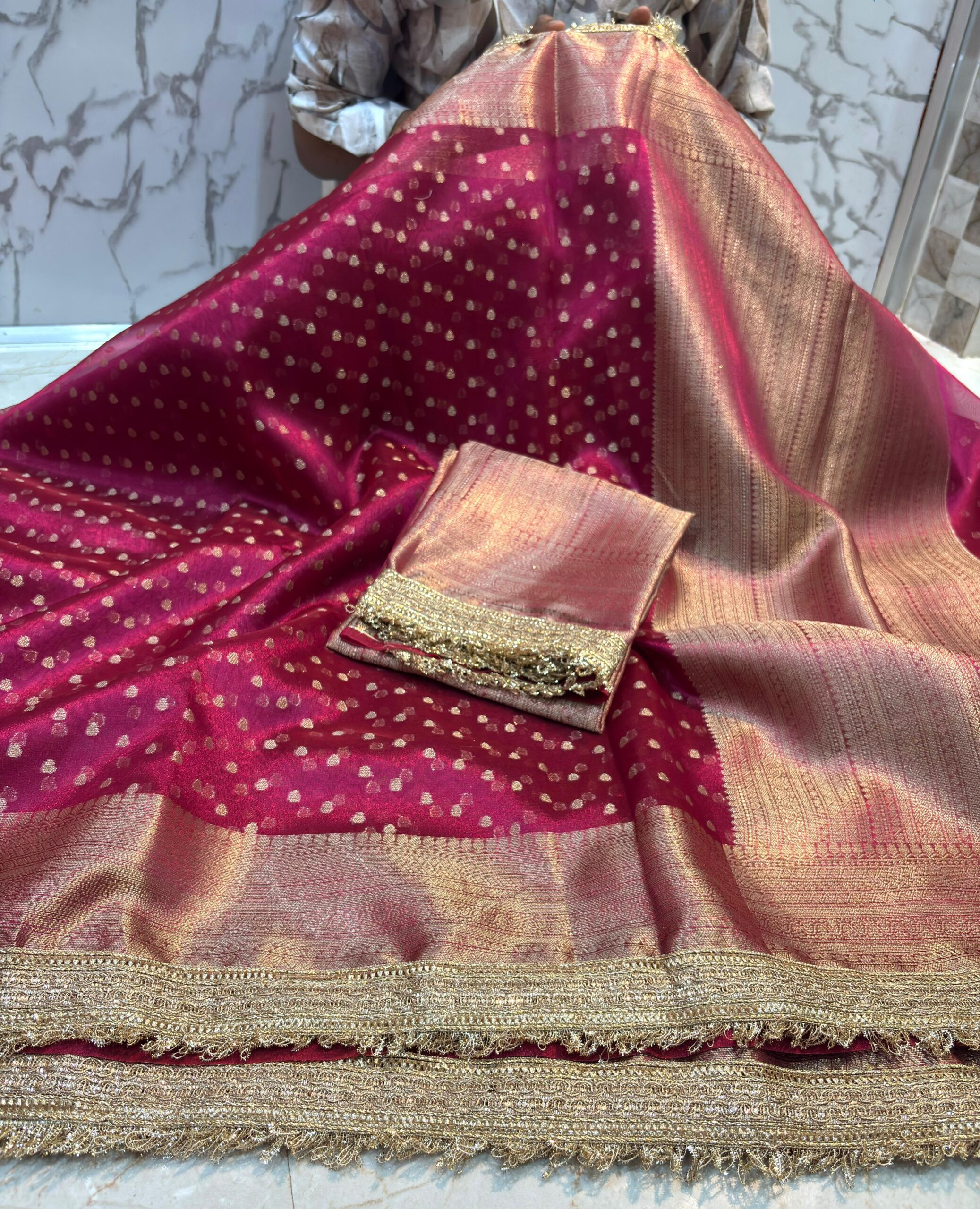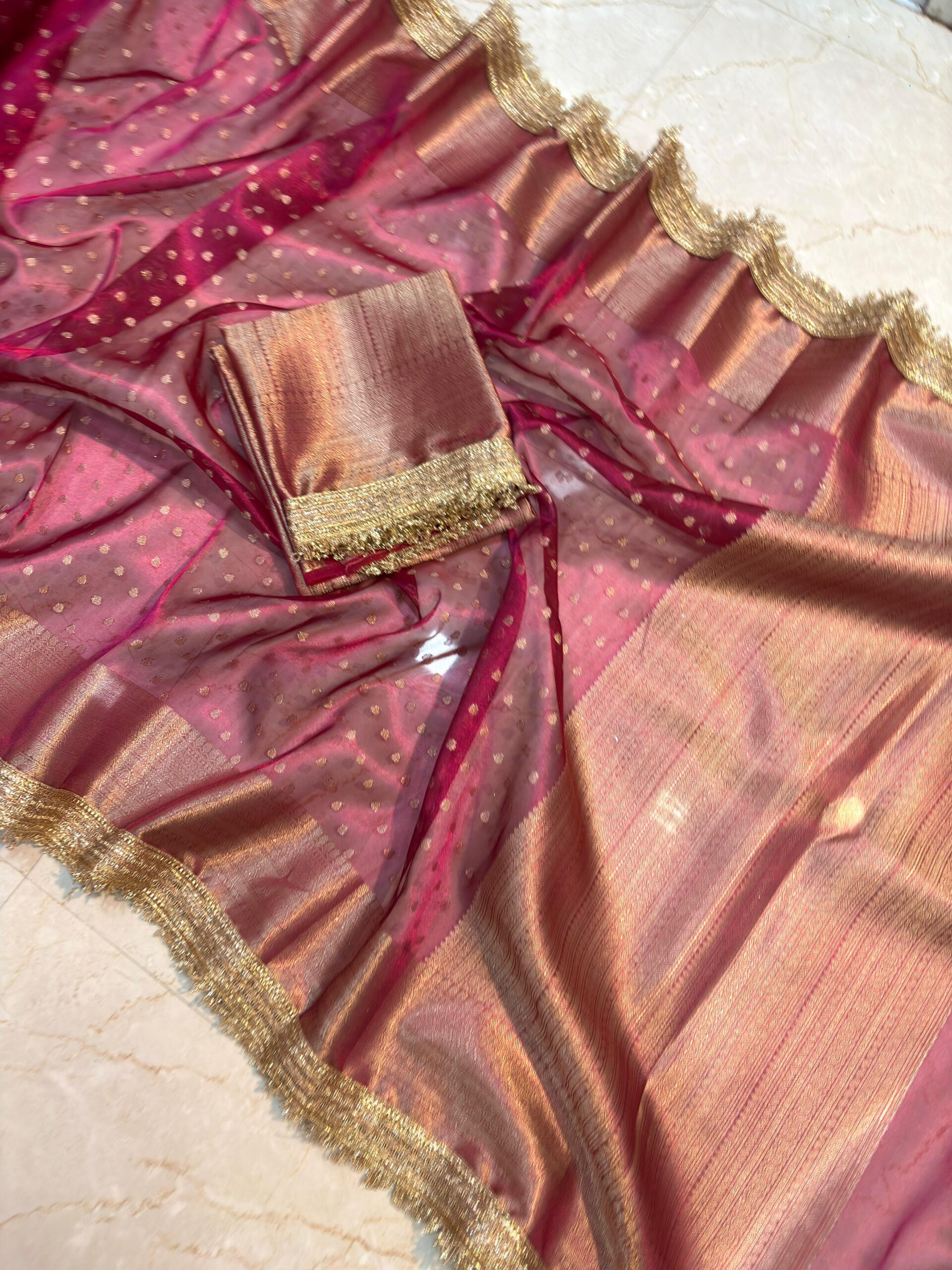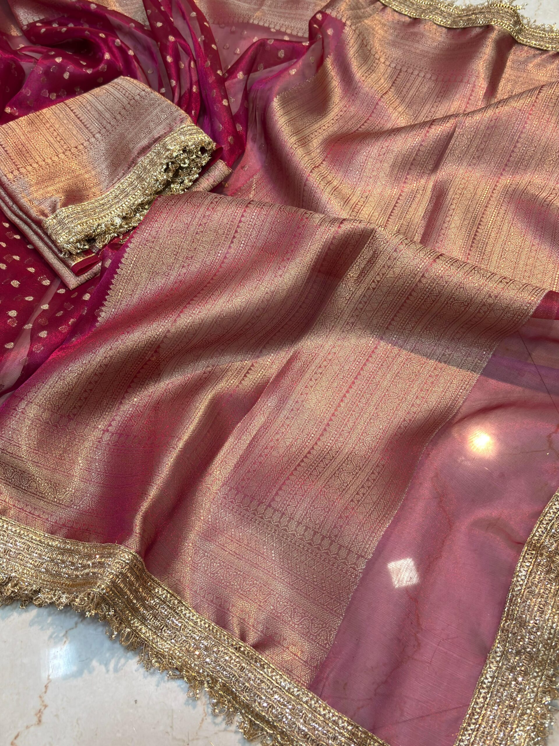 Fabric: Premium Banarasi Tissue — soft, glossy, and shimmering with a luxurious metallic finish.