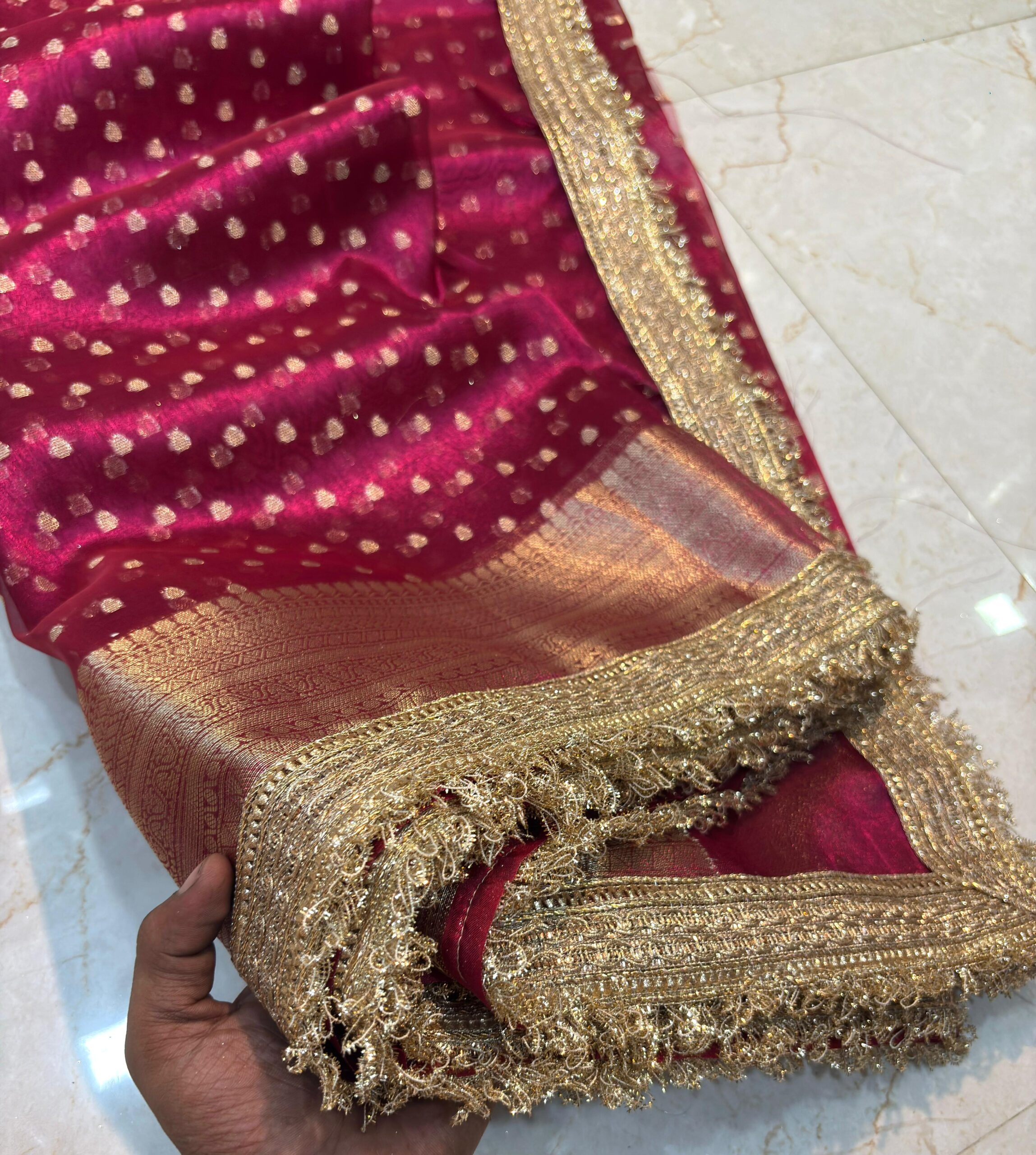 Weave: Fine machine-woven Banarasi zari work, reflecting light with every fold for a rich festive glow.