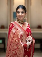 A breathtaking red Banarasi semi-georgette saree woven with intricate golden zari — light in feel, rich in look, and perfect for the modern-day bride who loves timeless tradition.