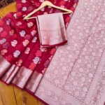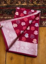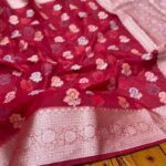 Be the first to review “Ruhani Red Kora Organza Banarasi Saree – Floral Weave with Silver Zari Border” Cancel reply