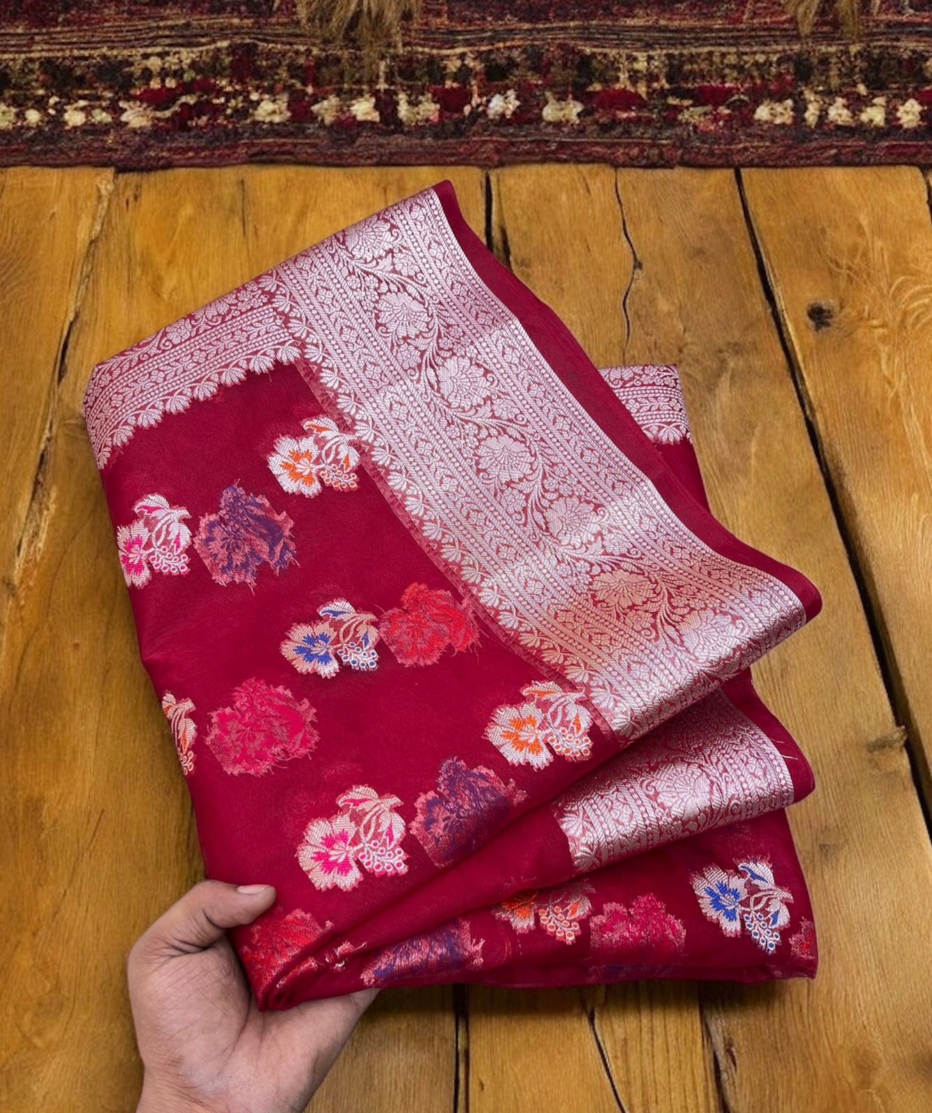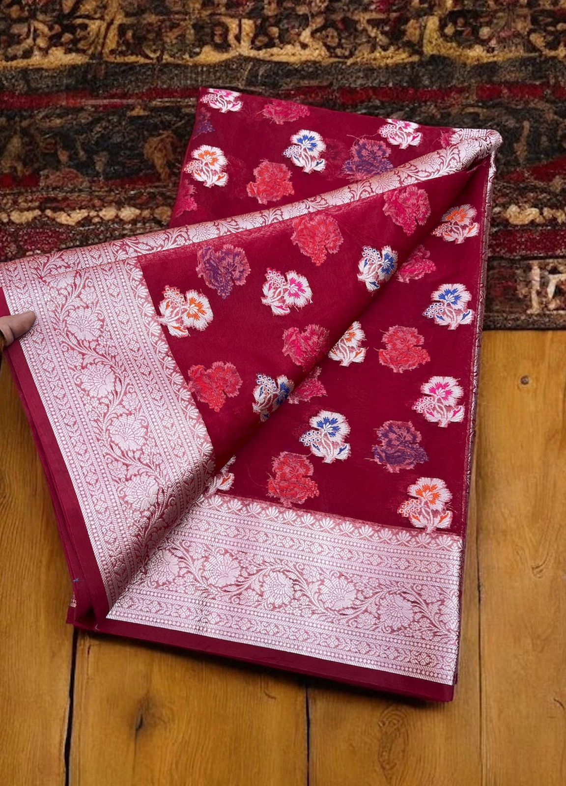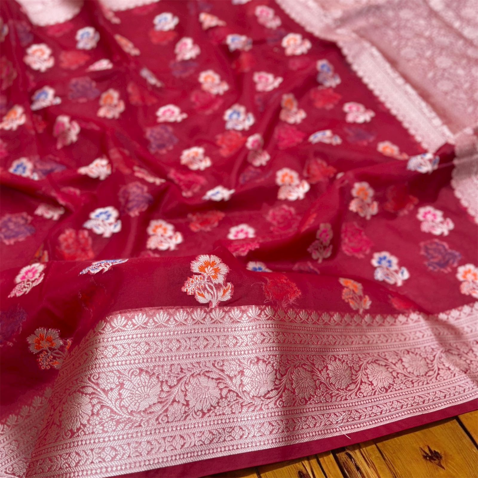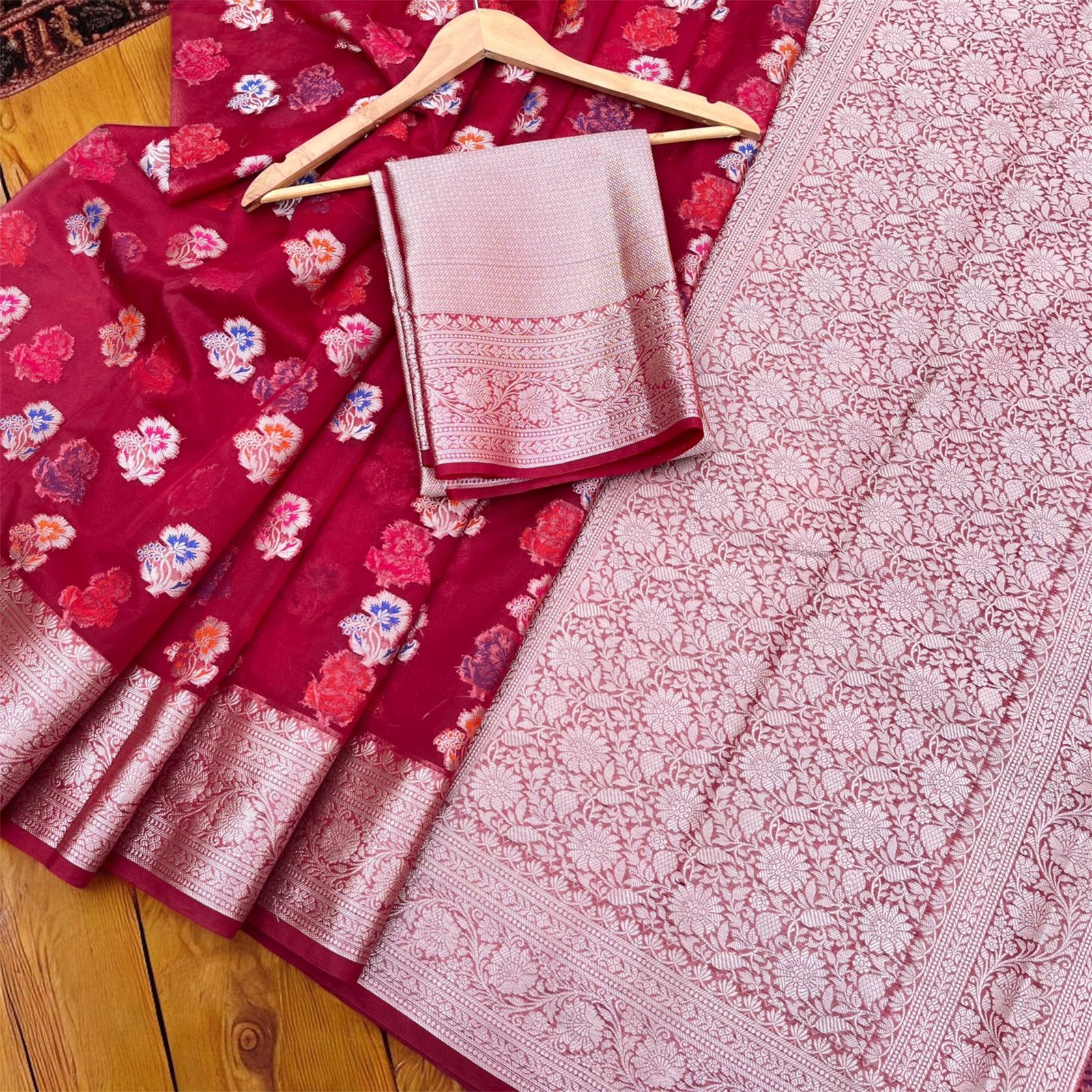 Ruhani Red Kora Organza Banarasi Saree – Floral Weave with Silver Zari Border