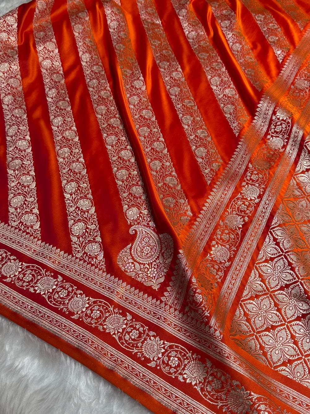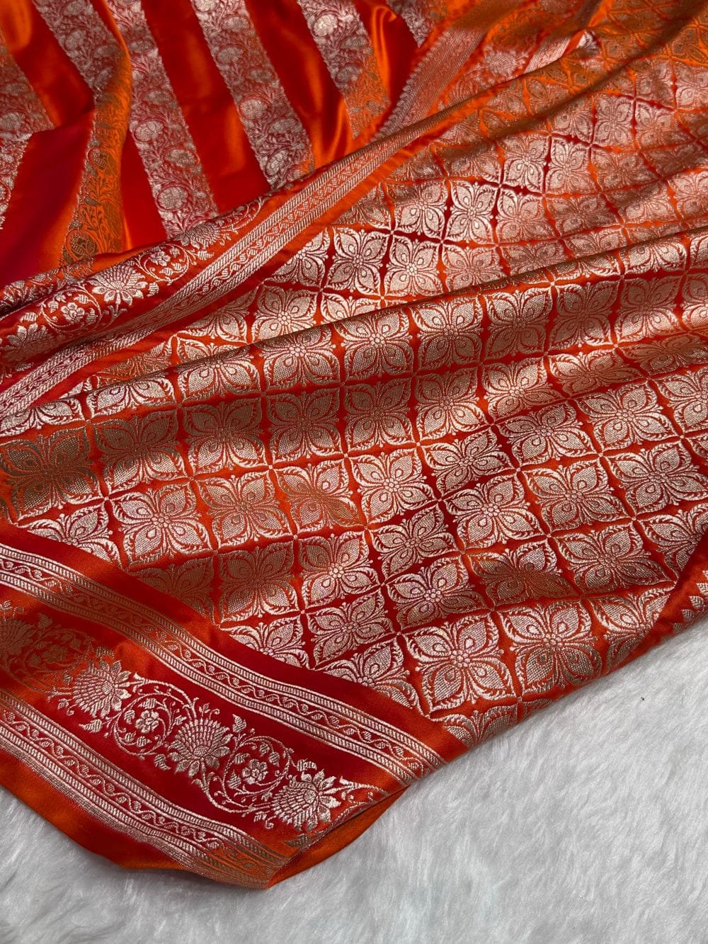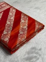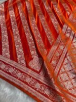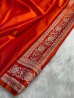 Orange Shades Banarasi Floral Mashru Silk Saree — a radiant blend of warm saffron tones and elegant cross-pattern florals, crafted in luxurious mashru silk. A celebration of festive vibrance and royal Banarasi heritage, perfect for weddings and grand occasions